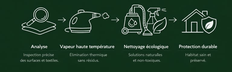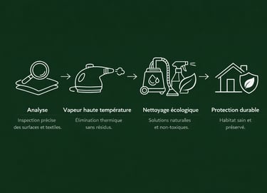 Nous combinons des techniques professionnelles (vapeur haute température, produits certifiés, solutions naturelles complémentaires) afin d’assurer une intervention efficace, sécurisée et respectueuse de l’environnement.